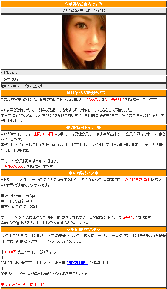 愛車はポルシェ○年齢 : 39才○送信日時 :○タイトル : メールをまず見て頂ければ幸いです。○本文 : VIP会員には男性側の優良会員を見る事が出来る専用BOXがあるんです。その中から選び貴方に決めました。お相手決まっていないのなら私に決めて頂けませんか?夜のお店を全国に持っています。条件は何でも聞きますよ。愛車はポルシェ○年齢 : 39才○送信日時 :○タイトル : 全国にお店を持ってますから。経済面○本文 : での心配はしないで頂きたいです。ある程度の事は何とかできると思いますよ。VIP会員専用のBOXから折角探したんですから是非いい出会いにしたいです。何時なんどきでも貴方の良い理解者になる事を誓います愛車はポルシェ○年齢 : 39才○送信日時 :○タイトル : 今ポイント譲渡の手続きが完了しました。○本文 : 貴方に対する気持ちが固まり譲渡システムを利用させて頂きました。良ければポイント受取って頂けますか?貴方にとって価値のある女になりたい。経済面では力になれますが、他に力になる事ありませんか?愛車はポルシェ○年齢 : 39才○送信日時 :○タイトル : 経済面は私に頼って下さいね。○本文 : その代わり私には一時の時間を頂けませんか?ほんの2時間位でもかまいません。店舗一つ位の出資はするつもりです。あくまで貴方にとっては割切りでもかまわないんですよ。大人のお付き合い出来ないでしょうか?