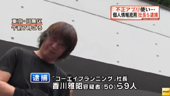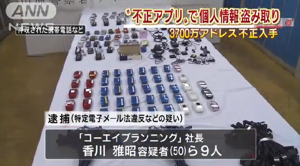 芸能人の関係者を装い他人名義のスマートフォン(多機能携帯電話)からメールを送ったなどとして、千葉県警サイバー犯罪課は24日、特定電子メール適正化法違反容疑などで、IT関連会社「コーエイプランニング」(渋谷区)社長香川雅昭容疑者(50)=目黒区青葉台=ら男女9人を逮捕した。いずれもおおむね容疑を認めているという。同社のパソコンには約3700万件のメールアドレスが保管されており、同課はスマホ用の無料アプリを装ったウイルスで個人情報を抜き取っていたとみて調べている。同課によると、スマホの不正アプリを使った事件では過去最大規模。逮捕容疑は2012年12月~今年3月、都内の専門学生の女性(19)ら2人の計三つのメールアドレスに、芸能人のマネジャーを装い「タレント本人があなたと話したがっている」と書かれたメールを送ったなどの疑い。同課によると、メールには返信用のアドレスがあり、出会い系サイトに誘導される仕組みになっていたという。不正アプリで3700万件流出 広告送信容疑で社長逮捕朝日新聞デジタル 7月24日(水)12時33分配信【真海喬生】スマートフォンから個人情報を抜き取ったとされる不正アプリ事件で、千葉県警の家宅捜索を受けたIT関連会社「コーエイプランニング」=東京都渋谷区=に流出したメールアドレスは3700万件に上ることが、県警への取材でわかった。不正アプリをめぐる事件では過去最多という。これらのアドレスに1日最大36万通の広告メールを送り付けた疑いがあるとして、県警は24日、その一部への関与について社長の香川雅昭容疑者(50)=東京都目黒区=と社員ら計9人を特定電子メール法違反(送信者情報の偽り)容疑などで逮捕した。逮捕容疑は、昨年12月~今年3月に他人名義のスマホから、タレントのマネジャーなど虚偽の送信者を名乗り、都内の専門学校生(19)など計3件のアドレスに、出会い系サイトの広告メール各1通を送ったとされる内容。また、広告メールの送信用に他人名義のスマホ9台を売買した携帯電話不正利用防止法違反(授受)の疑いもある。法人としての同社についても同じ容疑で書類送検する。<スマホアプリ逮捕>広告5000万通 サクラサイトに誘導
